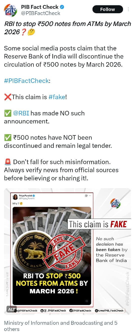 सोशल मीडिया पर PIB की फैक्ट-चेकिंग यूनिट ने पोस्ट करके बताया है कि रिजर्व बैंक ने 500 के नोट बंद करने की किसी भी तरह की कोई घोषणा नहीं की है. PIB ने बताया है कि RBI द्वारा मार्च 2026 तक 500 के नोटों को बंद कर देने का दावा पूरी तरह से गलत है और देश में इस तरह की अफवाहें फैलाई जा रही है. इससे साफ होता है कि मार्च 2026 के बाद भी 500 के नोटों का सर्कुलेशन पूरी तरह से जारी रहेगा और ये नोट पूरे देश में वैलिड रहेंगे.