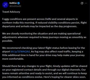 घने कोहरे के कारण, इंडिगो एयरलाइन ने बुधवार को एक यात्रा एडवाइजरी जारी की। एयरलाइन ने चेतावनी दी है कि कम विजिबिलिटी के कारण दिल्ली और उत्तर भारत के कई अन्य एयरपोर्ट पर फ्लाइट्स में देरी हो सकती है।